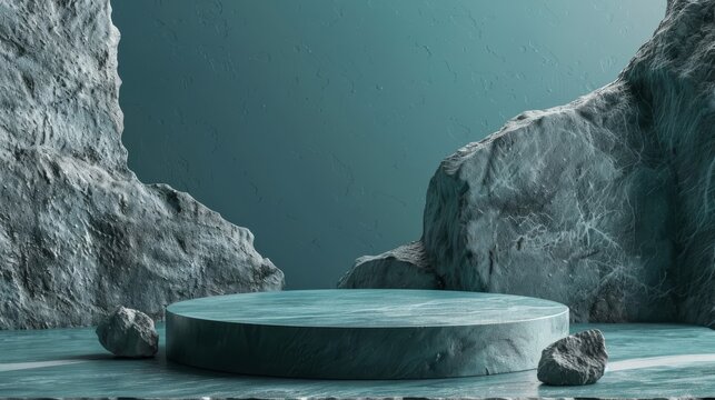 Amidst rocks, minimalist stone pedestal display contrasts against textured backdrop