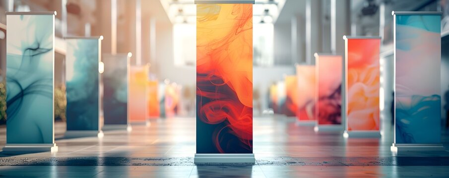 Colorful trade show banners in convention center, vibrant presentation
