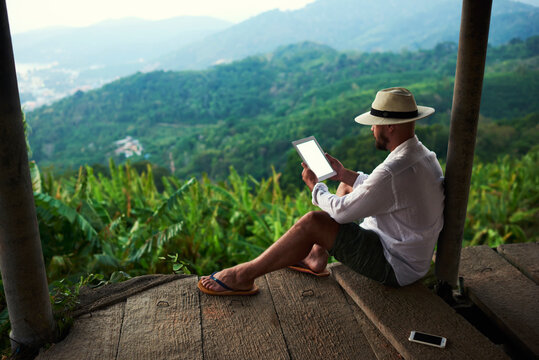 Male wanderer is holding portable touch pad with copy space on the screen for your text message or promotional content.Young man is reading financial news on digital tablet during his trip in Thailand