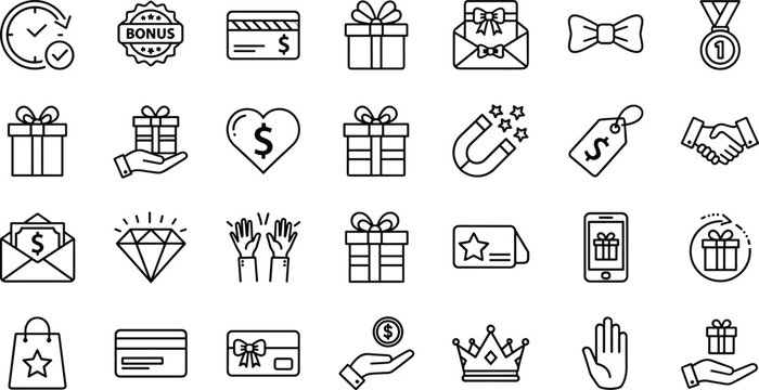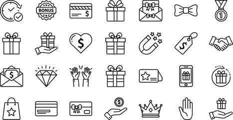 Loyalty card, incentive gift, collect bonus, earn reward, redeem gift, win present, vector mono line icon, linear illustration, outline design