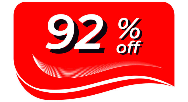 promotional tag with 92% off - red tag with rounded edges and white lines in waves, white text with shadows. Discount, offers, sales, reduction and promotion