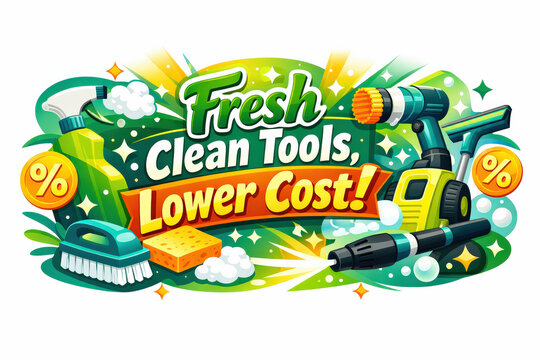 Powerful Cleaning Bargains. Seasonal holiday banner with promotional slogan, bright high-impact cleaning essentials banner