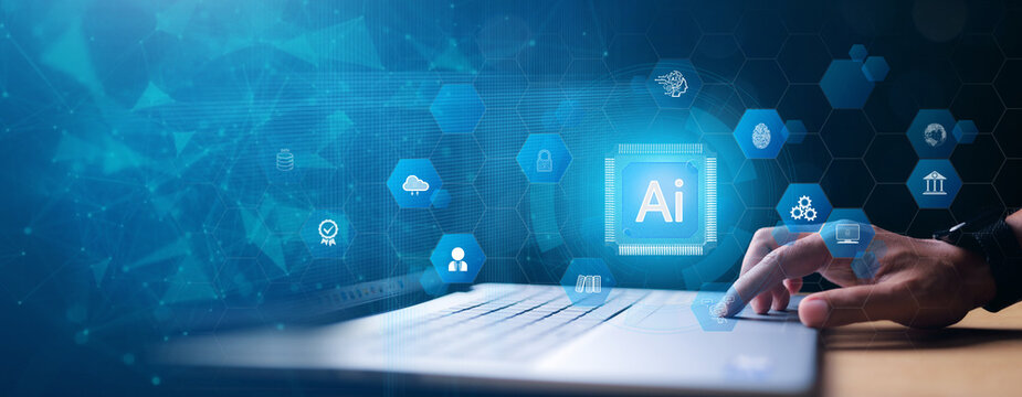 Ai tech, businessman show virtual graphic Global Internet connect Chat with AI, Artificial Intelligence. using command prompt for generates something, Futuristic technology transformation.