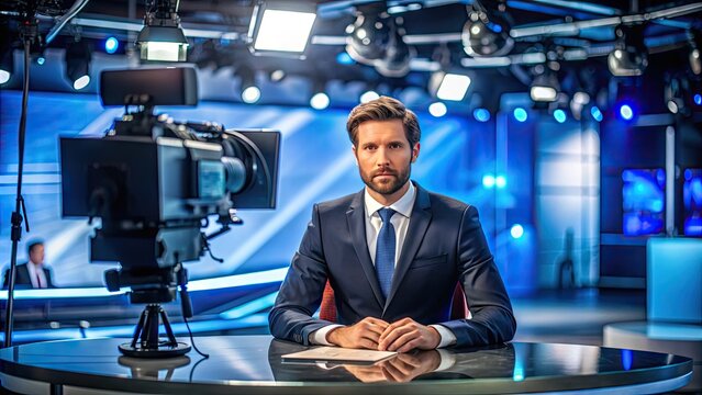 A professional news anchor sits confidently in a modern TV studio, surrounded by cameras and lights, preparing to conduct a live on-air interview.
