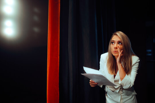 Prompter Behind curtains Feeding Lines to Actors on Stage. Director assistant hiding trying to artists the team perform on stage