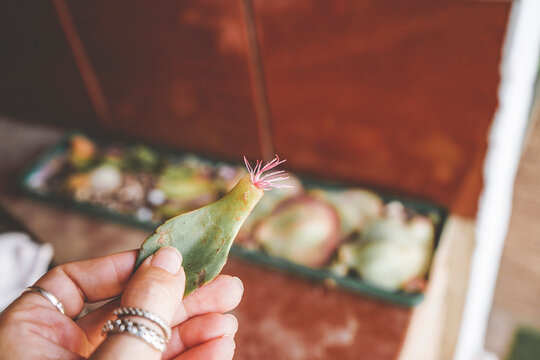 Succulent leaf propagation diy. Woman gardening at home planting plant leaves in potting mix propagator tray for sprouting. Indoor garden in apartment.