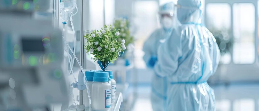 Medical professionals in full protective gear working in a sterile hospital environment with medical equipment and supplies visible.