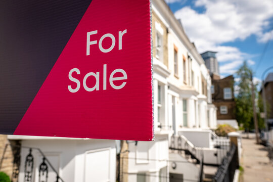 For Sale Sign on a Lawn in Front of a Modern House with Traditional Design. Real Estate Property, Mortgage, Housing Market and Home Ownership Concept.