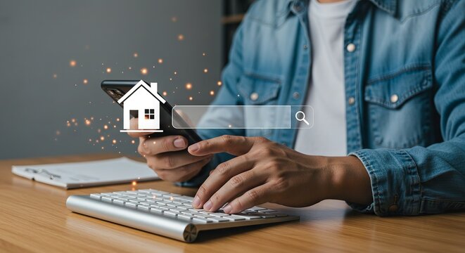 Man ripped paper with house silhouette. Concept for Real estate for sale. Vector available.