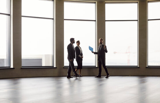 Business professionals in suits walking through spacious modern office with panoramic windows. Confident realtor presenting real estate, explaining project details to potential buyers or investors.