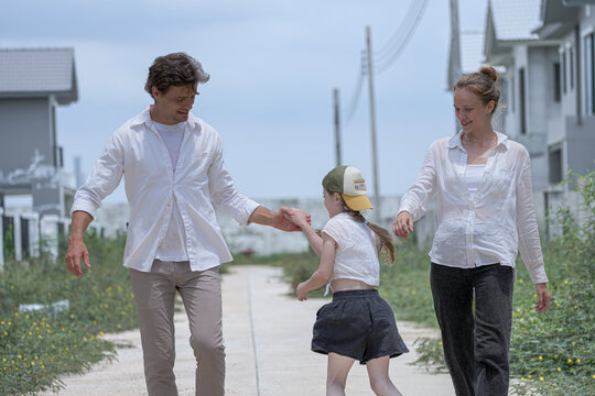 A cheerful family walks together through their new neighborhood. The smiling parents hold their daughter's hands, lifting her playfully as they enjoy a happy walk in front of their home.