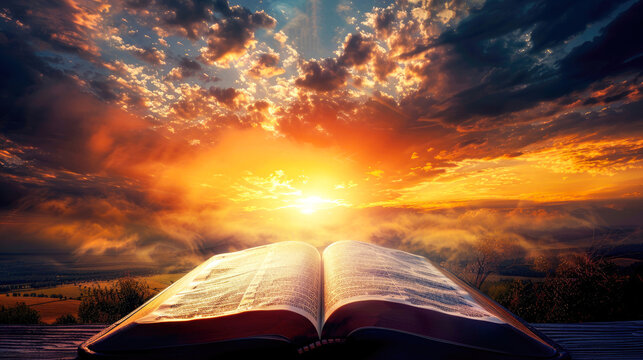 Dramatic scene with a bible on a wooden surface against a sunset, signaling the end of a day and the contemplation it brings