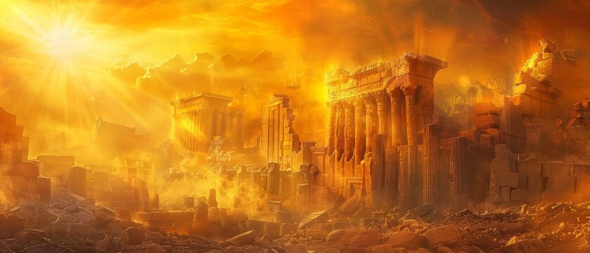 An ancient prophecy foretells the apocalypse, painting the horizon in golden hues, over a ruined temple with blurry background, scifi photo, Sharpen banner