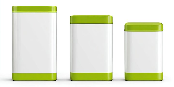 Three empty, rectangular, metal tins in varying sizes, each with a lime-green lid and white body