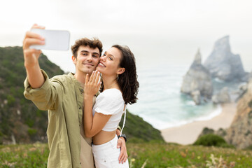 Happy loving couple embracing and taking selfie after engagement, capturing moment on photo