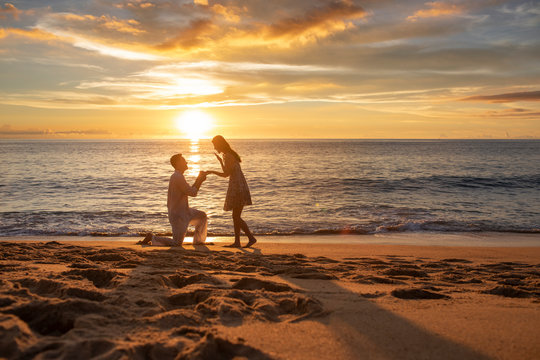 Photo of happy man making proposal to his excited woman with ring while walking on sunny beach