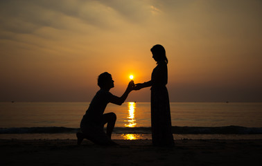 Silhouette of young man with rose proposing to his beloved on the sea beach, Romantic date, Wedding and Valentines day concept - Vector illustration