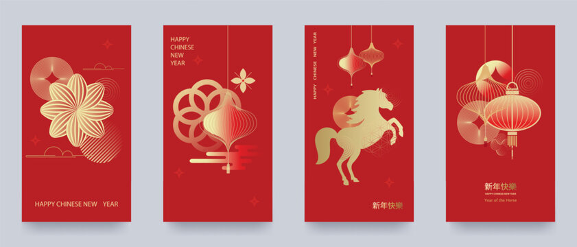 Chinese New Year 2026, Year of the Horse. A set of greeting cards featuring a horse and geometric patterns. A template for festive envelopes. Translation: Happy New Year, zodiac sign. Vector