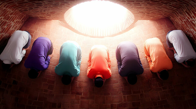 Flat vector illustration of multiple human silhouettes kneeling, bowing, and prostrating in various poses of prayer and, isolated on white background