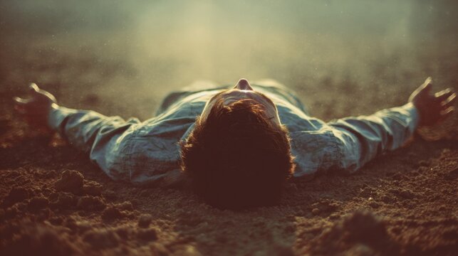 Concept photo of a person lying prostrate on the ground, arms spread wide to the heavens, utterly surrendering to Gods will in the Garden.