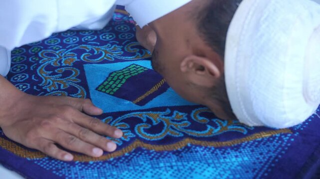 Portrait of asian Muslim Boy wearing traditional costume is doing Salat with prostration pose on the prayer mat