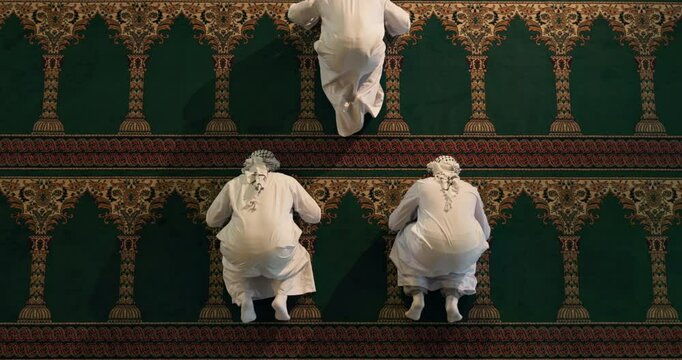 People, praying and prostration in mosque for religion, top view and worship in islam for gratitude. Men, above and community in salah for spiritual praise, faith and muslim in sujood for Allah