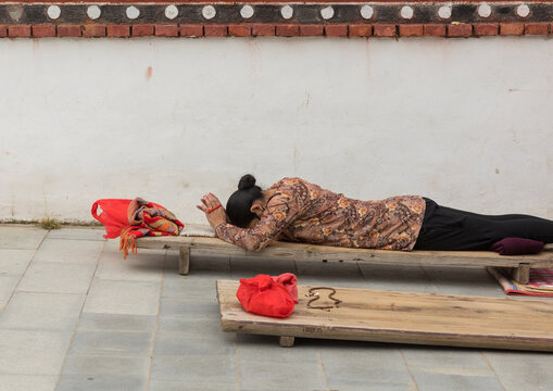 Tibetan pilgrim woman praying and prostrating in Hezuo monastery, Gansu province, Hezuo, China