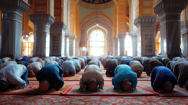 Muslim men in prostration during prayer in a mosque at sunset Muslim men praying in Mosque interior.