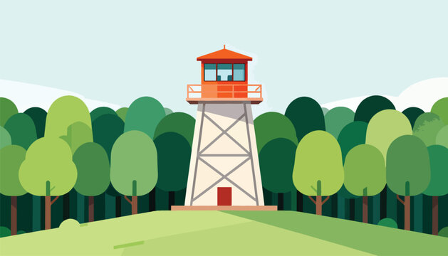 Minimalist illustration of an orange observation tower amidst a dense forest of green trees