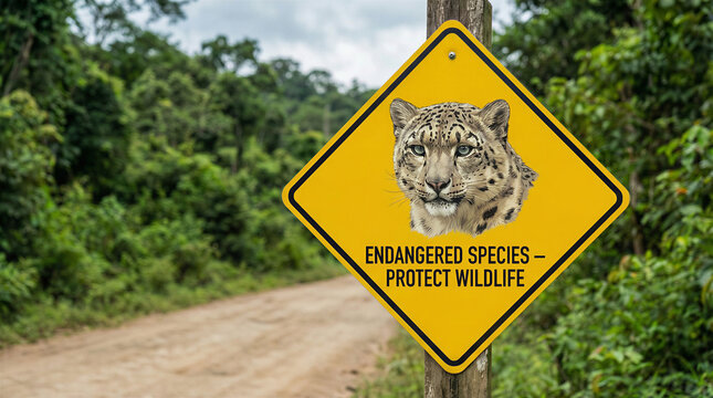 A bright yellow diamond-shaped road sign mounted on a wooden post reads: "Endangered Species - Protect Wildlife."