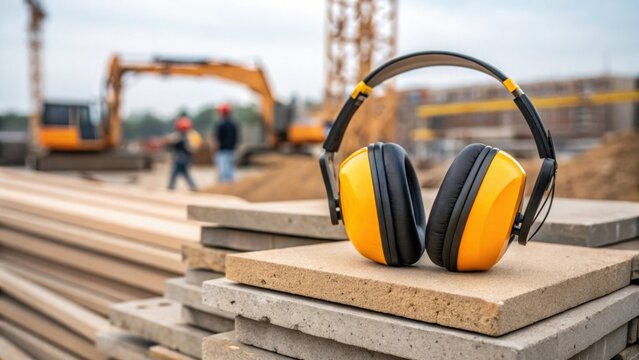 A bright yellow sign emphasizes the need for hearing protection in a busy industrial setting, highlighting safety measures for workers.