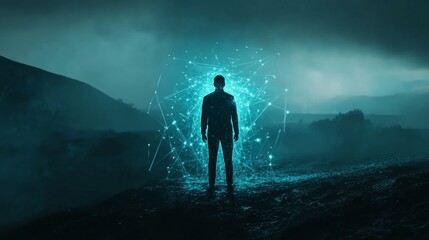 Virtual protective field, advanced holographic barrier technology, glowing in a dark modern landscape