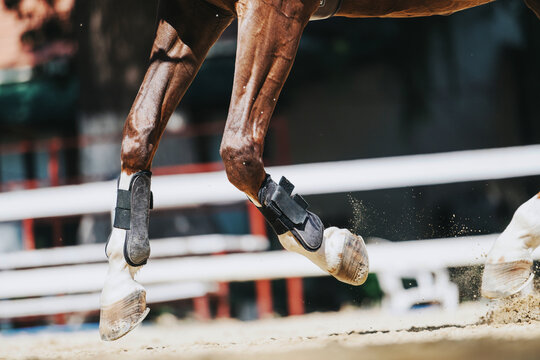 Dynamic capture of a horse's legs galloping on a sandy surface, showcasing the equestrian sport. The horse is equipped with protective gear, highlighting speed and movement.