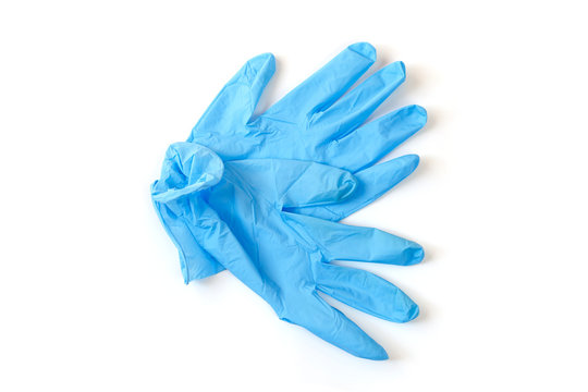 Two hands wearing nitrile gloves on a white background