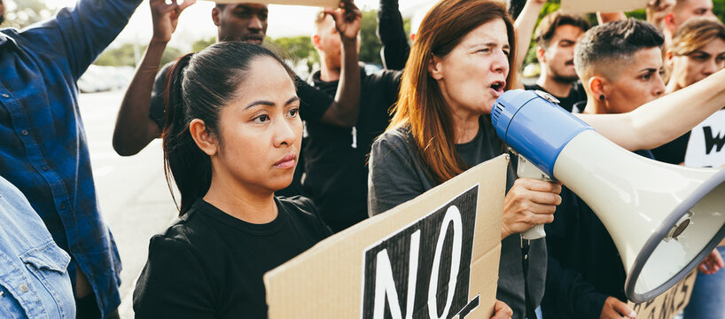 Men and women share a protest sign  hold a megaphone. Mob concept, The youth crowd gathered to protest.