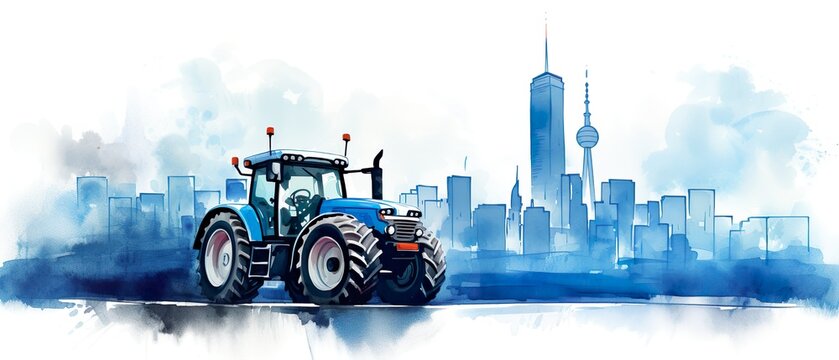 a blue tractor in front of a city skyline, Watercolor illustration, concept, conflict, food supply, protest for liberty and against  subsidy cuts