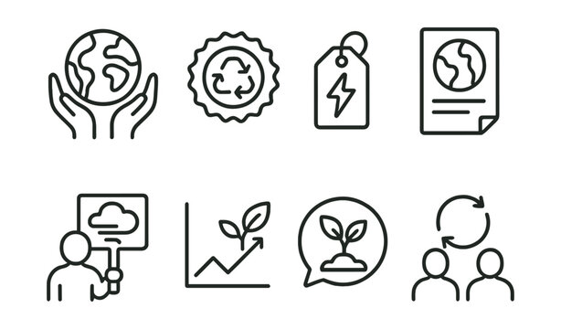 Line style icons of environmental activism: earth protection icon, recycling badge, green energy tag, climate protest file, clean air board, sustainability chart, nature conservation bubble, eco