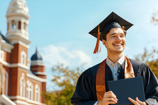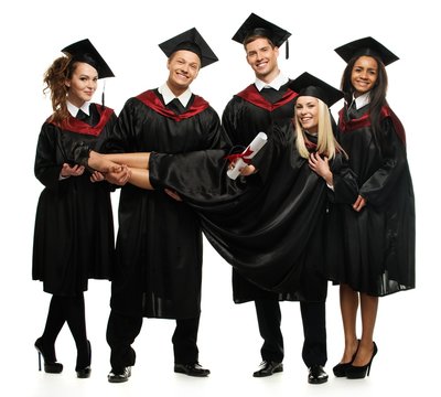 Graduation ceremony. Young female graduate hugging each other with her mother congratulate the student at the university.