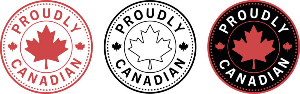 A red and white emblem with a maple leaf and the words proudly canadian