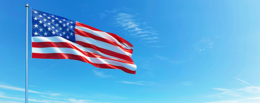 Vibrant American flag proudly waving against a clear blue sky, symbolizing freedom, patriotism, and national pride. Ideal for Fourth of July, Veteran's Day, Memorial Day, and election-related designs