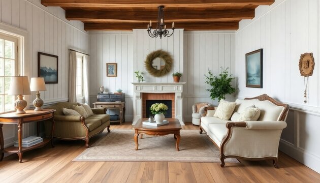 French Provincial Cabin Living Room with vintage furniture, soft upholstery, and rustic touches like distressed wood beams. The skirting boards are made of light oak and have a slight distressing