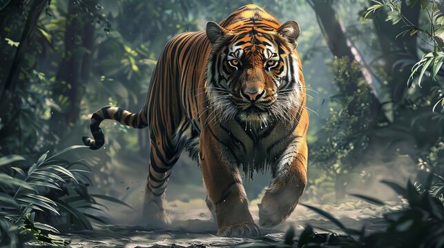 majestic tiger prowling in wild jungle realistic digital art illustration
