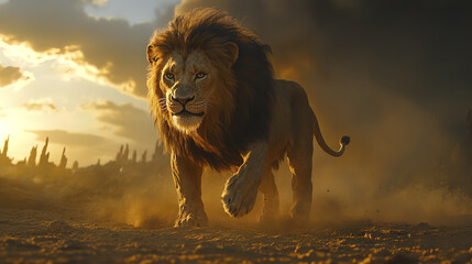 Majestic male lion prowling across dry terrain, mane flowing in wind