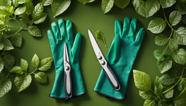 Gardening gloves with scissors and pruners on green surface surrounded by leaves