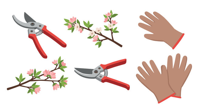 Gardening tools and cherry blossoms pruners and gloves in flat design