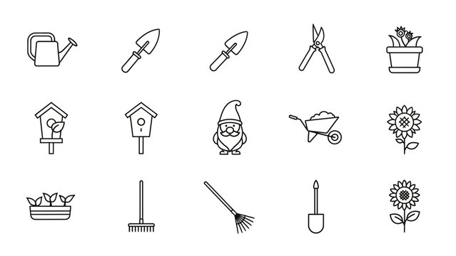 Collection of various gardening icons including tools and plants presented in a clean line art style