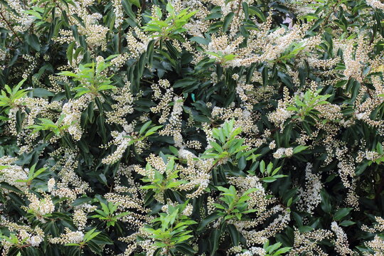 hedge of cherry laurel with white raceme inflorescences