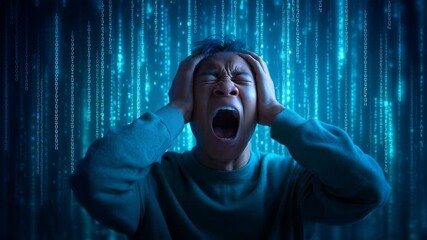 Emotional representation of technological exhaustion, depicting young individual overwhelmed by digital information, hands pressed against ears, expressing intense psychological strain