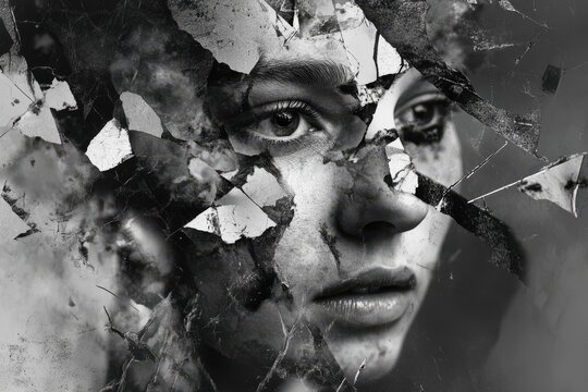 portrait of psychopathic girl with mental paranoid disorders. Black and white with 3D glitch virtual reality effect