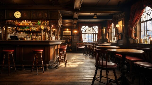 Classic bar scene with a traditional pub interior, showcasing wooden paneling, vintage decor, and a warm, inviting ambiance